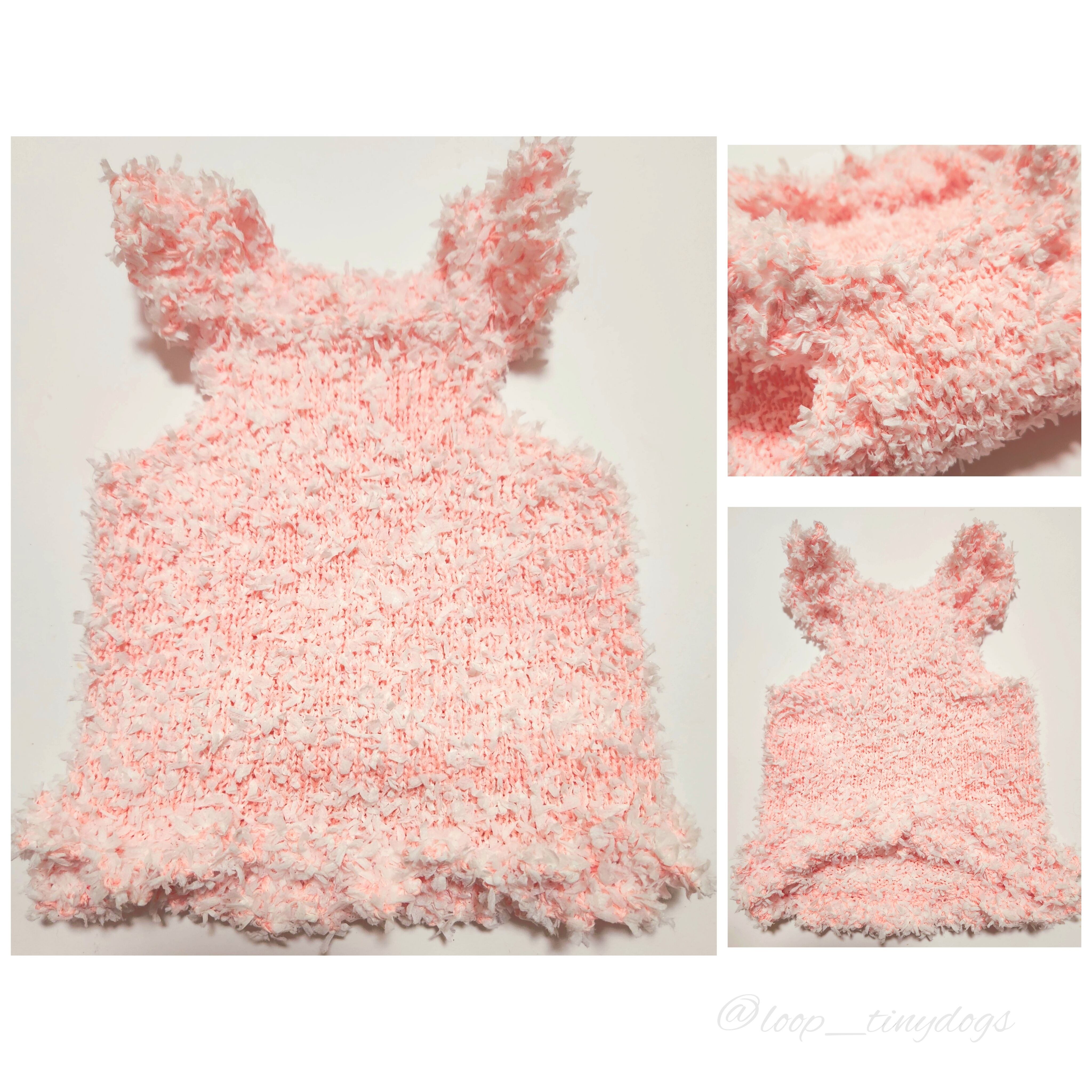 コットン(コーラルピンク)をベースに、オフホワイトのファンシーヤーン(スラリットヤーン)を引き揃えた華やかで可愛い編地です。